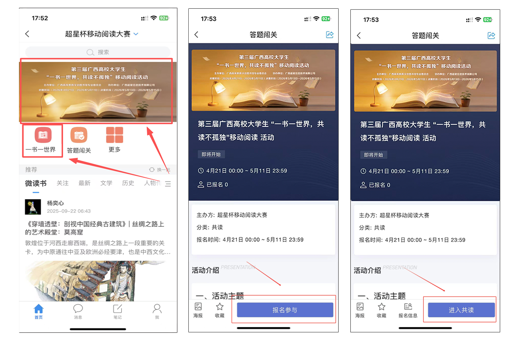 为深入贯彻落实党的二十大报告关于“深化全民阅读活动”的决策部署和习近平总书记关于读书学习的重要论述精神,在全区高校进一步营造“爱读书、读好书、善读书”的良好文化氛围,使阅读成为一种习惯,广西高等教育学会图书馆专业委员会决定举办第三届广西高校大学生“一书一世界,共读不孤独”移动阅读活动。现将活动有关事项通知如下: 一、活动主题 一书一世界,共读不孤独 二、组织机构 主办单位:广西高等教育学会图书馆专业委员会 协办单位:广西超星信息技术有限公司 组织单位:南宁理工学院图书馆 三、参与对象 广西区各高校在校大学生 四、活动时间 (一)初赛阶段(2026年4月21日—2026年5月11日) 初赛阶段各单位参赛者在活动时间内通过超星学习通或移动图书馆APP中的共读模块按照流程进行报名并阅读本次活动中的共读图书、打卡、撰写书评获取积分; (二)决赛阶段(2026年5月13日—2026年5月15日) 决赛阶段参与答题闯关获取积分进行排名。 评选规则: 个人排名:个人初赛积分≥2000分的参赛者,按照决赛答题闯关得分从高到低,选取获奖者。同分数参赛者则按照答题时长排序。 单位排名:综合各单位参赛者的总积分【计算方式:各单位参赛者初赛有效积分(各单位≥700分参赛者的初赛积分总和)+各单位参赛者决赛积分总和】。 若发现参赛者存在异常违规行为,则取消其获奖资格。 五、奖项设置 本科院校组和高职高专院校组分别设置如下奖项: 一等奖(5名):荣誉证书及华为平板 二等奖(20名):荣誉证书及吹风机 三等奖(40名):荣誉证书及双肩包 六、参与方式 1.平台登录 ①老用户:直接登录超星学习通或移动图书馆APP。 ②新用户:下载并登录超星“学习通”或移动图书馆APP,新用户使用手机号实名注册并按提示输入单位信息,老用户使用单位账号或已绑定的手机号进行登录。 2.活动参与 ①登录app后首页右上角邀请码处输入邀请码"cxb"进入活动界面。 ②初赛阶段点击首页轮播图或者“一书一世界”模块,右下角点击报名参与按照提示完成报名,返回首页点击右下角进入共读界面阅读图书即可。 ③决赛阶段点击活动界面“答题闯关”模块参与答题闯关即可。 1. 参赛须知 活动页面,阅读相关介绍,了解活动规则。 初赛积分规则: ●图书阅读:每日阅读活动页图书每分钟得2分,每日积分上限为100分。 ●书评发表:发表一条不少于50字的书评,可获得2积分。每天通过评论获得的积分上限为20积分,每本书每天评论积分上限20积分。(请勿频繁评论,否则评论会被封12小时)。 ●图书打卡:每天可在任意一本图书中打卡,每日限打卡1次,每次打卡可获得1积分。 答题闯关积分规则: (1)本次闯关答题共设置6关,题目均为单项选择题,需要依次通关来解锁关卡。每个关卡都设置有对应题目,每关20题,每题5分,80分即可过关。过关后不可再次重复答题。 (2)每日答题次数为3次,每次答题都会消耗答题次数,其中每关通过、未通过或中途退出,系统均默认消耗掉一次答题机会,中途退出不保存得分。 (3)每关排行依据为本关通关分数和通关时间;总排行依据依次为通关总分数和通关总时间。 七、联系方式 活动咨询QQ群(参赛者加一个群即可):1015918785、1001298390 (一审:廖葵莉;二审:蒋宜辰;三审:周敏)
