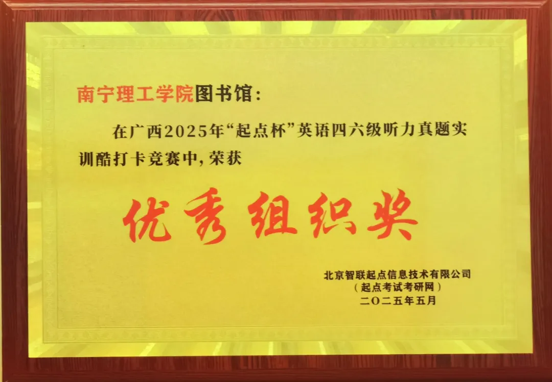 近期,广西2025年“起点杯”英语四六级听力真题实训酷打卡竞赛已圆满落幕。此次竞赛全区共有33所学校9164名在校大学生参赛。经过30天的打卡答题竞赛,最终我校学子邓业潼荣获“三等奖”,蒋金丽荣获“优秀奖”。 “三等奖”荣誉证书 “优秀奖”荣誉证书 在本次竞赛中,我中心图书馆在组织策划、宣传发动等方面表现突出,荣获“优秀组织奖”。负责本次竞赛的图书馆老师廖葵莉、朱小蕾荣获“优秀指导教师奖”。 “优秀组织奖”奖牌 “优秀指导教师”荣誉证书 “优秀指导教师”荣誉证书 此次竞赛展现了我校学子们勤学笃行的精神风貌,祝贺获奖同学斩获佳绩!愿同学们以赛促学,持续精进英语应用能力,共同营造积极向上的学习生态。 (一审:朱小蕾;二审:廖葵莉;三审:周敏)