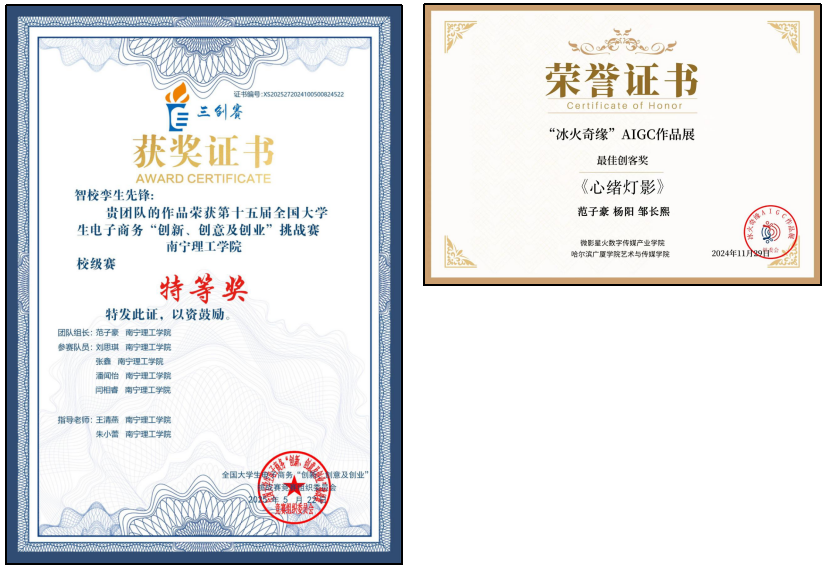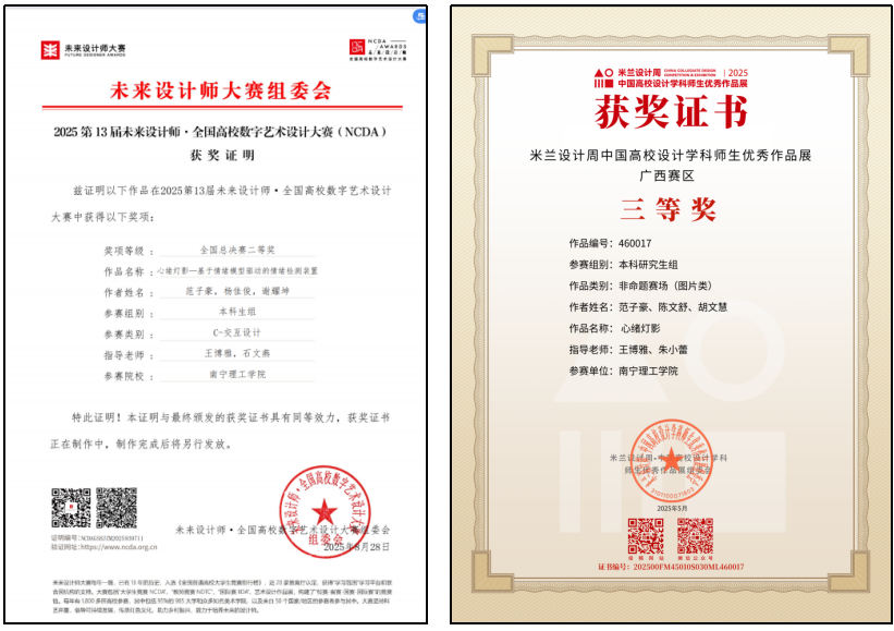 近日,我校南宁校区图书馆“艺术工坊” 展区内的特色文创作品格外引人注目,这些作品源自2023级数字媒体艺术专业范子豪团队和2022级播音专业曹珉团队的竞赛项目成果,由两支团队分批捐赠,为知识殿堂注入多元青春创意。 此次捐赠从不同创意视角挖掘文化内涵,创新了知识传播形式,达成了特色美育与文化传播的有机结合。 来自图小画工作室的范子豪团队,其作品 “心绪灯影”—— 基于OpenCV的情绪大模型的实时疗愈技术研究依靠高精度情绪识别技术(融合 OpenCV 视觉、生物传感器、机器学习)捕捉细微情绪,为情绪调节提供支持。智能灯光依 AI 分析的情绪数据调整颜色与闪烁频次,不同光影可安抚情绪或增强愉悦感。此外,全息投影与灯光呼应营造氛围、缓解压力,情绪卡片印着基于积极心理暗示原理的哲理话语或温馨图案。观看者拿起卡片,文字图案触发积极情感思考,灯光调节视觉,全息投影增强沉浸体验,三者构建全方位情绪疗愈体系。 曹珉团队的“蛋花香”系列作品以广西特色花卉鸡蛋花为原型打造IP,融入壮锦元素,展现广西文化。常点缀于广西街巷的鸡蛋花,承载壮乡人民对美好生活的期许,为 IP 赋予地域标识与清新气质。壮锦作为中国四大名锦之一,其绚丽色彩与精美图案凝聚壮族智慧,让作品不仅是视觉享受,更是宣传广西自然之美与人文魅力的载体。 据悉,两支团队的作品均有亮眼成绩:范子豪团队获国家级“全国高校数字艺术设计大赛(NCDA)”二等奖,区级“中国高校设计学科师生优秀作品展”三等奖 ,校级“三创赛”特等奖和“‘冰火奇缘’AIGC作品展”最佳创客奖,更成功取得计算机软件著作权登记证书,团队全方位展现了在设计创新与技术研发领域的综合实力。 (校级奖项荣誉证书) 曹珉团队项目凭借对地域文化的创新表达,斩获校级创意竞赛一等奖,相关研究《广西“鸡蛋花”文化符号:从文化记忆向艺术价值转化》已发表于国内期刊,且在2025年国际大学生艺术节路演环节中,团队通过实物展示、创意解说等形式,生动呈现 “鸡蛋花” 文化符号的转化过程,获校外嘉宾一致认可。 此次分批捐赠是我校学子将竞赛成果转化为校园文化资源的具体实践。此外,部分实用性文创作品如钥匙扣、书签、冰箱贴等,将作为读者互动礼品发放,激励更多同学参与到校园文化建设之中。 摄影/学生团队 文稿/严皓严 (一审:严皓严;二审:蒋宜辰;三审:周敏)(作品现场照片)